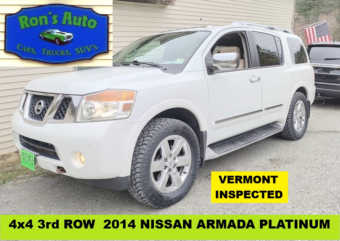 2014 Nissan Armada Platinum 3rd ROW SEATING VERMONT INSPECTED 4 Door SUV, 4×4, 5.6- V-8, Automatic, Power Windows, Locks, Mirrors, Moonroof & Seat, AM/FM/CD/DVD 195195 Miles White $8995