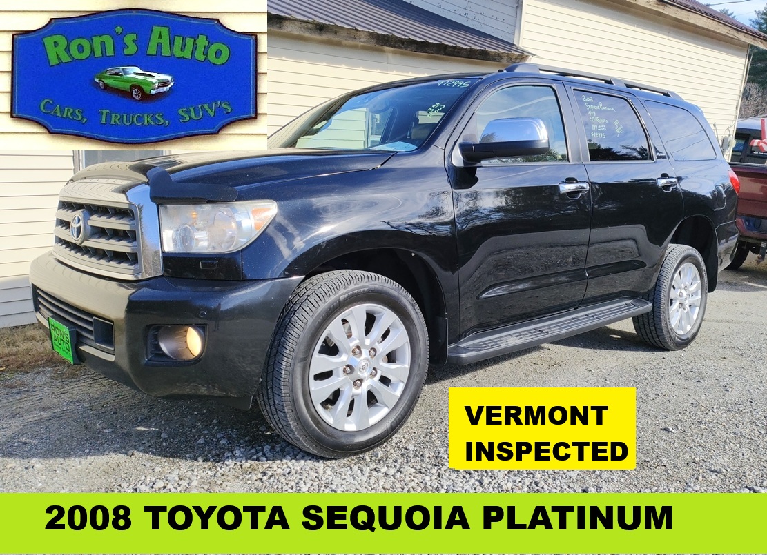 2008 Toyota Sequoia Platinum 3rd ROW SEATING VERMONT INSPECTED 3rd ROW SEATING 4 Door SUV, 4×4, 5.7- V-8, Automatic, Power Windows, Locks, Mirrors, Moonroof & Seat, AM/FM/NAV/SAT 199610 Miles Black $10995