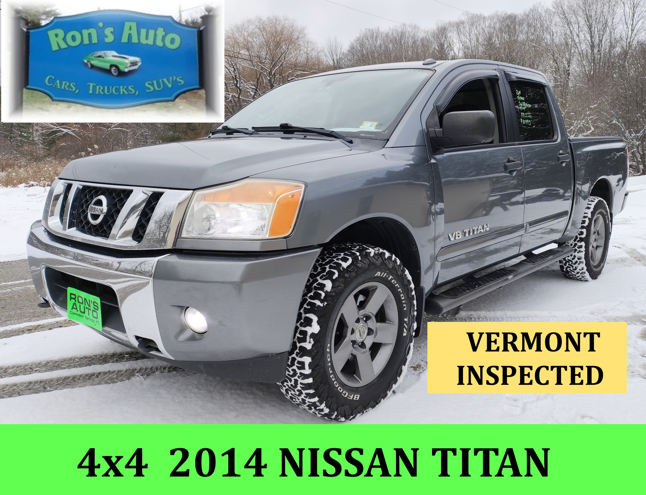 2014 Nissan Titan VERMONT INSPECTED CREW CAB PICKUP TRUCK, 4×4, 5.6- V-8, Automatic, Power Windows, Locks & Seat, AM/FM/CD 179590 Miles Gray $10995